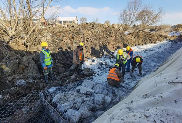 11月29日上午,東遼縣室外溫度達到零下13℃,但是高標準農田建設施工正火熱進行。在建安鎮4標段東壁村的施工現場,挖掘機傳出隆隆聲響,工人們在河溝中破冰施工,將裝好的石籠網箱按照要求埋入河底。