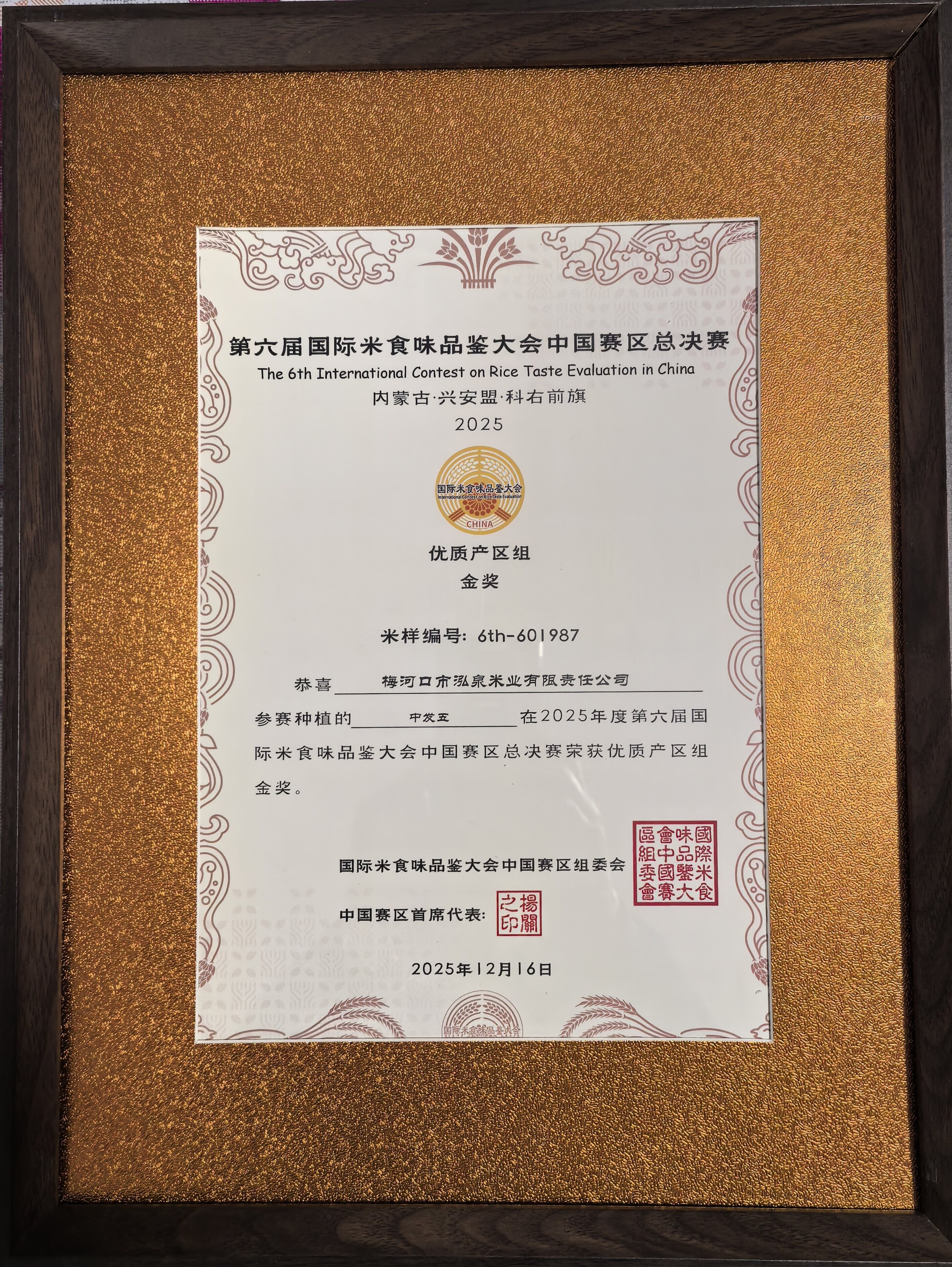 近日,第六屆國際米食味品鑒大會中國賽區總決賽在內蒙古自治區興安盟舉行,梅河口市泓泉米業有限責任公司“中發五”稻米獲得優質產區組金獎,為“吉林大米”品牌再添光彩。
