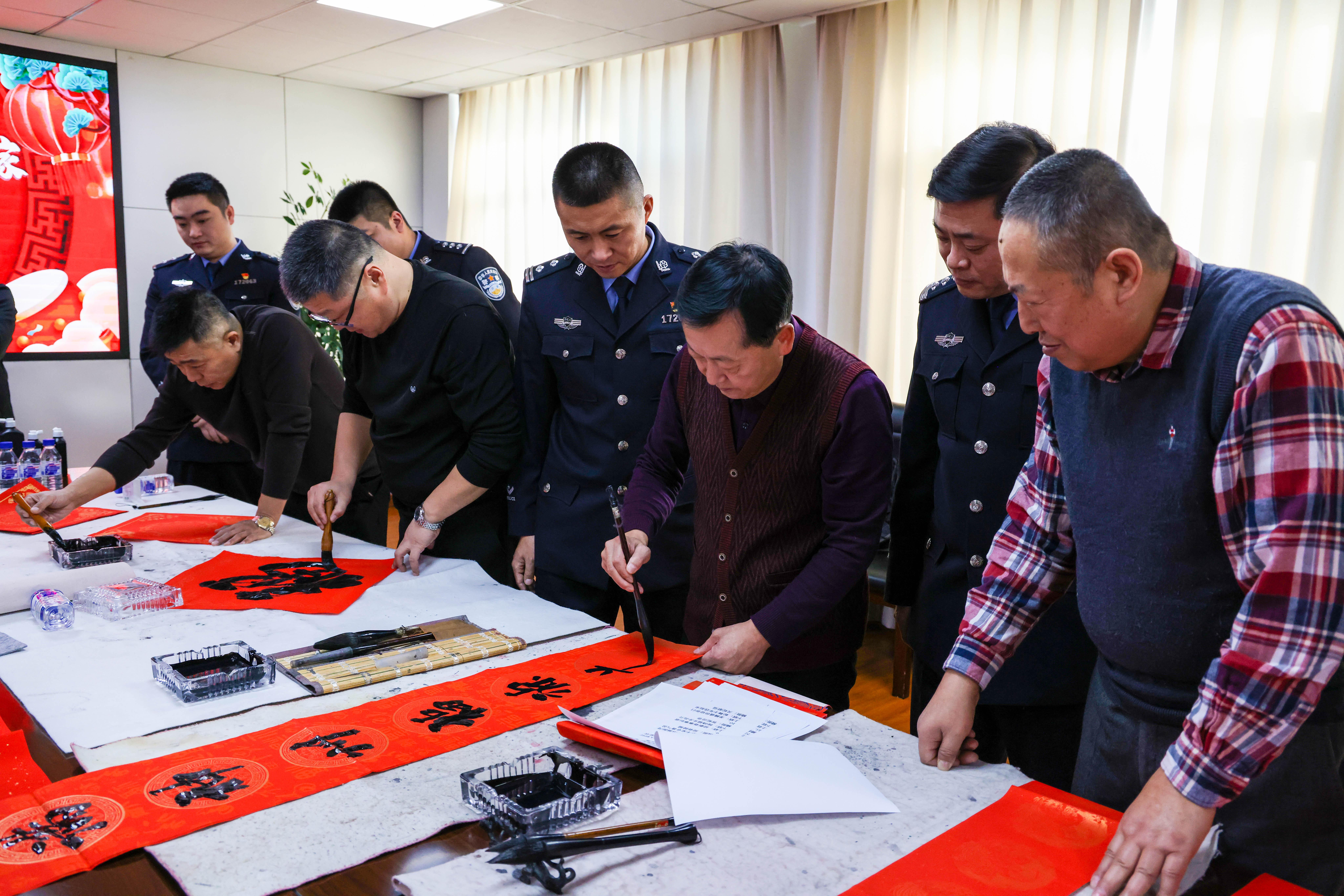 在活動現場,長桌鋪設、毛氈打底、墨香四溢,延邊硬筆書法協會主席王玉寶、龍井書法協會主席劉加英等七名書畫家們即興揮毫潑墨。他們一邊創作,一邊和民警交流,講解書法技巧、解讀春聯文化。民警們認真聆聽觀摩,不時幫忙抻紙遞筆硯墨,現場洋溢著一派歡快、祥和的氣氛。 一上午的時間,書畫家們將對迎新春賀新年的情感傾注于筆端,一副副對聯一蹴而就,一張張福字一氣呵成,一對對象征吉祥如意的春聯一一排開,濃濃年味和溫馨祝福躍然紙上?!袄斡浭姑呅l國展壯志,堅守初心保境安民譜新篇”“移民征途砥礪奮進謀復興,國境哨崗忠誠值守保民安”......這些作品飽含書畫家們對全體民警的崇高的敬意和美好的新春祝福。期間共完成書畫作品200余幅,給即將到來的新春佳節增添了濃厚的年味。 “ 還是手寫的春聯比較有靈氣、更有年味,這字寫得瀟灑自如,真是打動人心?!痹诖郝摃鴮懍F場民警徐琪說。受到現場濃厚氛圍的感染,民警們也紛紛踴躍嘗試。他們拿起毛筆,認真地書寫著,力求用最美的書法、最真誠的心愿,寫下對新年的美好憧憬。