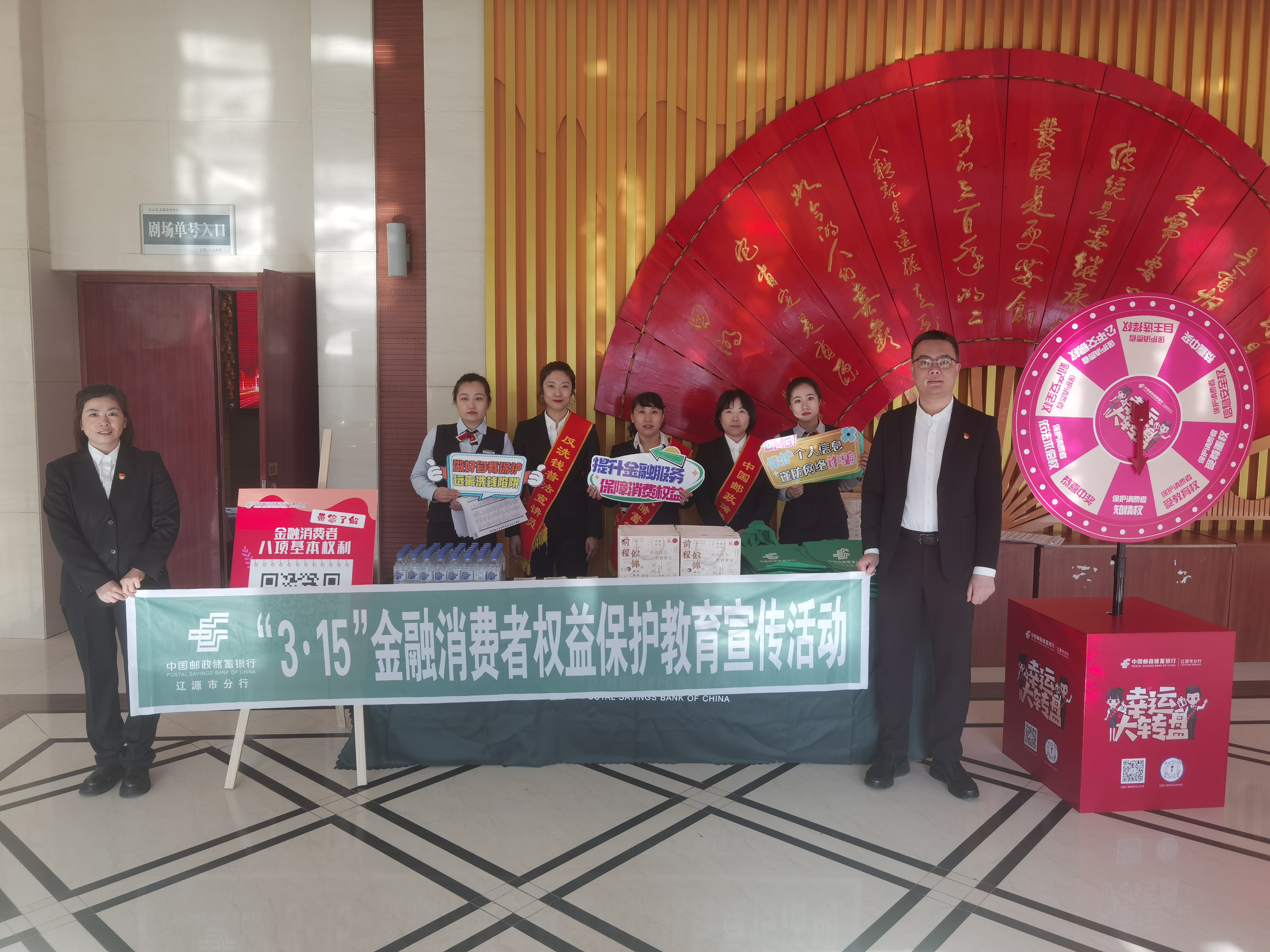 活動當日,會場外布置了金融知識宣傳活動專區,擺放反洗錢及防范非法集資宣傳展架,普及金融知識,幫助消費者正確認識金融產品和服務,提高識別防范非法金融活動的能力;擺放H5二維碼展板,引導消費者掃碼金融消費者八項基本權利,了解自身合法權益,增強維權意識;擺放金融知識幸運大轉盤,吸引消費者積極參與,設置了參與獎及幸運獎,參與獎為印制帶有“金融消保在身邊,保障權益防風險”的無紡布兜,幸運獎為帶有“前程似錦,金榜題名”的筆記本禮盒,提高教育宣傳活動的新穎性、趣味性、互動性。 進入會場后,多媒體主屏幕循環播放宣傳視頻,兩側屏幕播放宣傳口號,會場張貼宣傳條幅,主持人現場講解金融知識、金融服務政策,現場與消費者互動交流、答疑解惑,積極營造“學金融、懂金融、信金融、用金融”良好氛圍。