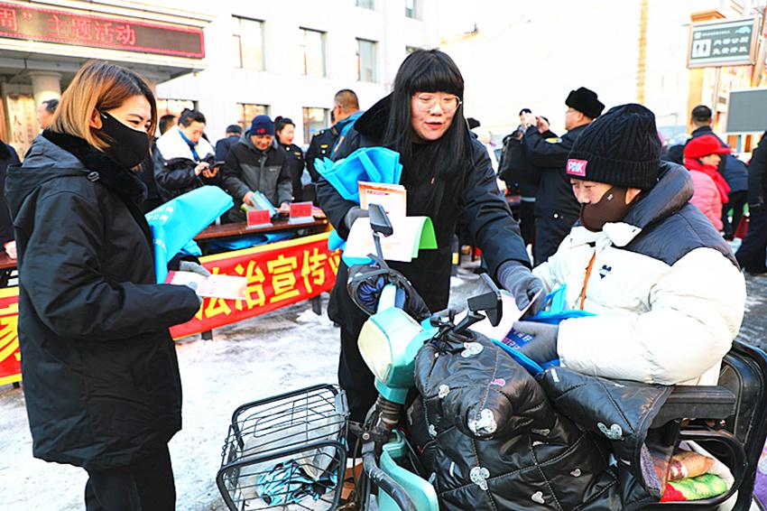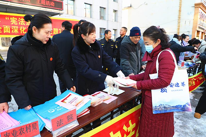 為進一步弘揚憲法精神,全面建設法治中國,12月4日,在第十一個國家憲法日到來之際,撫松縣人民法院機關普法干警來到撫松鎮(zhèn)人群密集地段參與全縣憲法日社會宣傳活動。當日,萬良法庭(人參產業(yè)法庭)也在駐地與鎮(zhèn)司法所、派出所、法學會法律基層服務站等單位走上街頭聯(lián)合開展憲法日普法活動,院庭同頻共振迅速掀起普法外宣活動新熱潮。