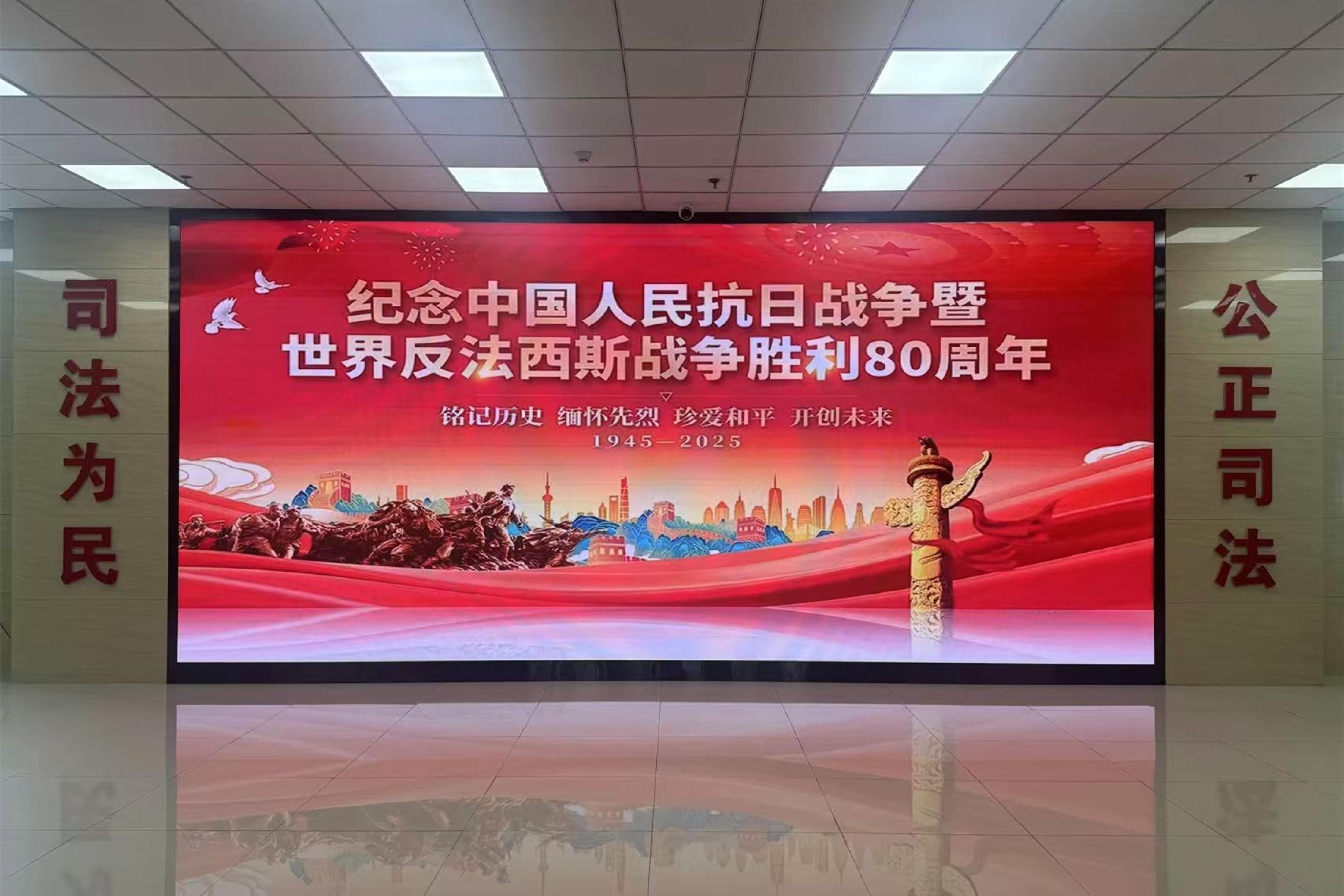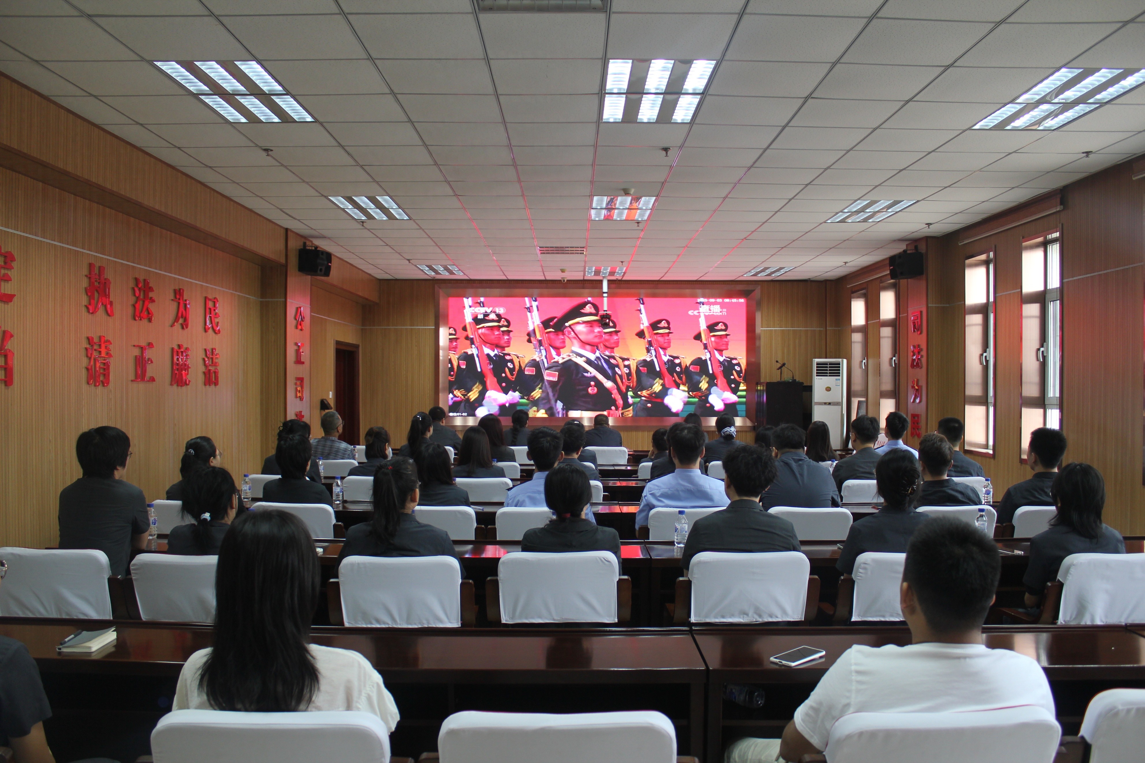在院機關視頻會議室,全體黨員干警身著筆挺制服,目光聚焦大屏幕,認真觀看儀式直播,隨著畫面中莊重的場景、激昂的旋律,干警們心潮澎湃、熱血沸騰,深刻感受閱兵式背后蘊含的使命擔當與精神力量。 與此同時,分布在轄區各鄉鎮的派出法庭也組織干警集中觀看,雖人數不多,但坐姿端正、神情專注,即便身處基層一線,也始終與院機關同頻共振,共同在沉浸式觀看中汲取奮進力量。 三代干警話擔當,薪火相傳譜新篇 為讓紅色教育更具感染力、更有代入感,集中觀看閱兵式后,德惠法院特別策劃“老中青三代干警談感悟”活動,邀請老黨員干警、中層骨干干警與青年干警代表錄制專題視頻,將心得感悟一一分享,讓“法治初心”在薪火相傳中愈發堅定。 海報展播濃氛圍,法治精神入人心 為進一步營造濃厚的主題活動氛圍,擴大教育覆蓋面,德惠法院充分利用內外宣傳陣地,在法院大門外電子大屏、各樓層電梯間顯示屏等位置,循環播放主題紀念海報。通過海報展播,不僅讓主題黨日活動氛圍更加濃厚,更讓法治精神、為民理念以更直觀的方式走進群眾心中。