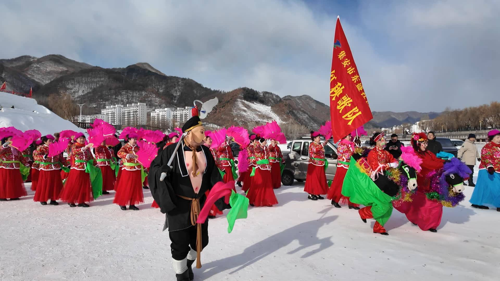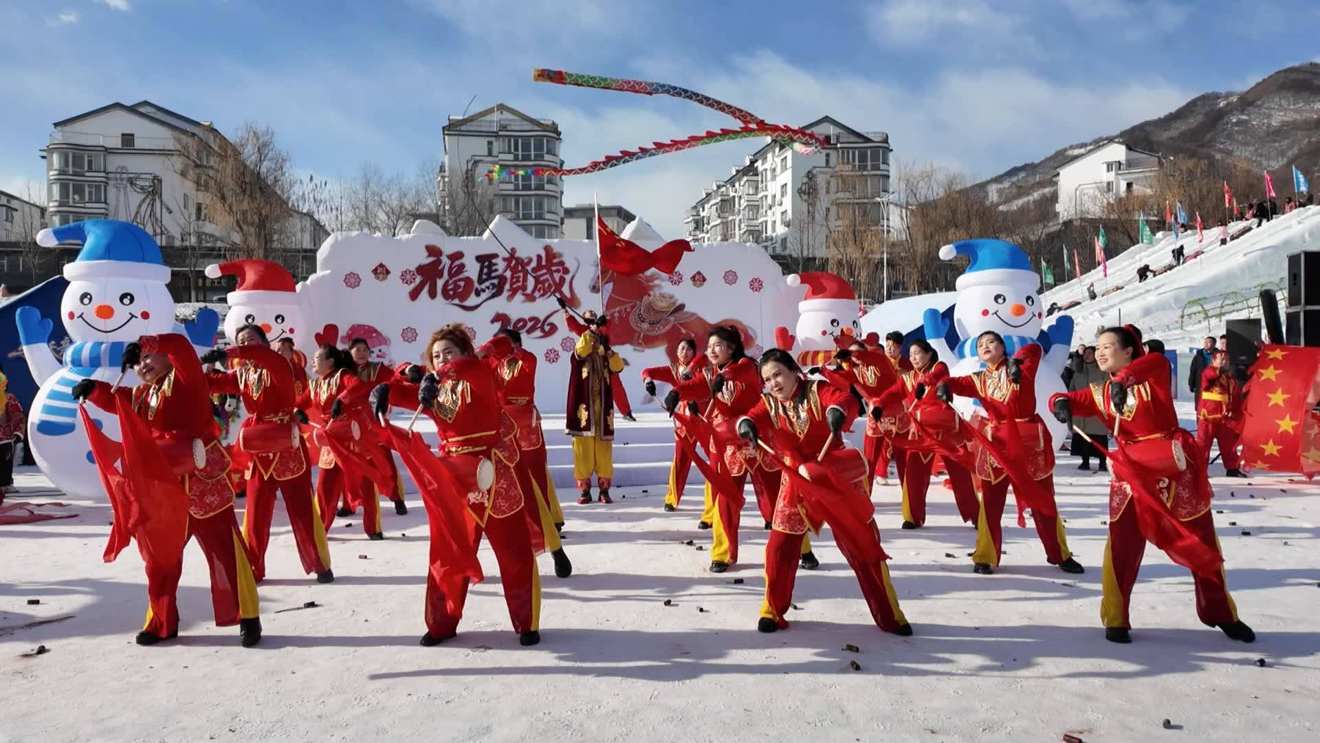 開業(yè)儀式在激昂的歌舞《愛我中華 鼓動(dòng)中國》中拉開帷幕,鏗鏘鼓點(diǎn)與冰雪景致相映成趣,瞬間點(diǎn)燃現(xiàn)場(chǎng)熱烈氛圍。隨后,傳統(tǒng)秧歌表演火熱登場(chǎng),孫悟空、豬八戒等經(jīng)典形象的融入,更為演出增添了靈動(dòng)趣味。演員們身著絢麗彩裝、手舞火紅綢帶,個(gè)個(gè)神采飛揚(yáng),將濃濃年味灑滿整個(gè)冰雪樂園,讓游客在盡享冰雪樂趣的同時(shí),沉浸式感受中華優(yōu)秀傳統(tǒng)文化的獨(dú)特魅力。